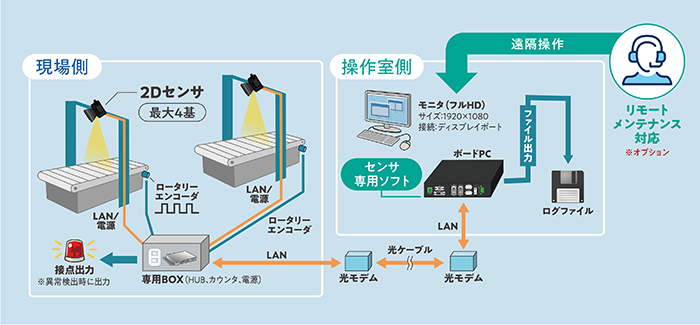 「H-TM-B」は、2D測域センサ(データ出力タイプ)をベルトコンベアの上部に設置し、搬送物にレーザ光を照射することで、搬送物の高さデータを取得します。