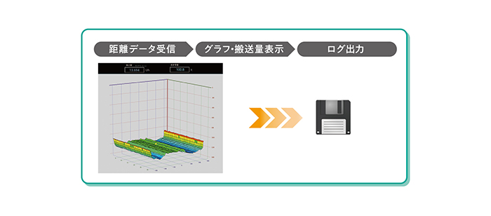 さらに、搬送量や合計搬送量・搬送距離などのデータをCSVまたはバイナリ形式でリアルタイム出力し、時間ごとのファイル保存もできます。