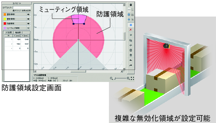 さらに、ワークの搬出口や複雑な間口などもミューティング入力により、防護領域の一部を無効化、また複雑な無効化領域を簡単に設定することができるため、 ライトカーテンでは難しい領域設定が実現可能です。